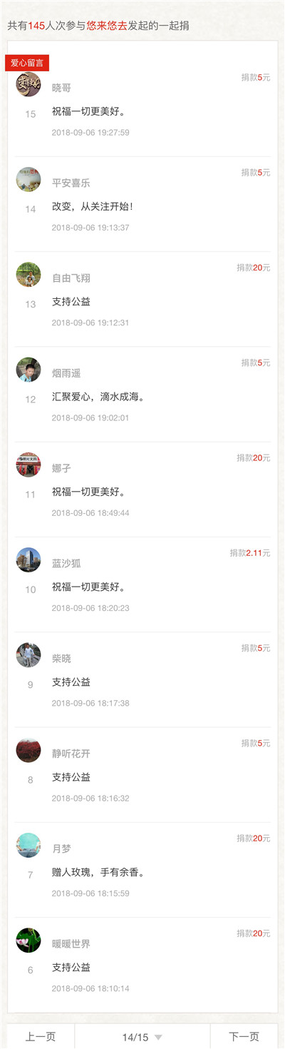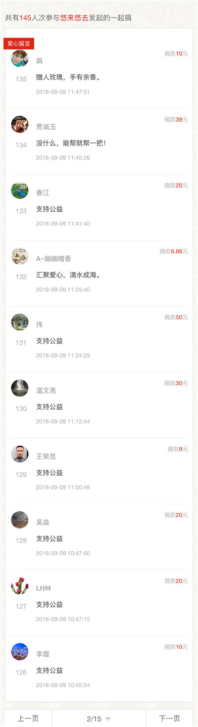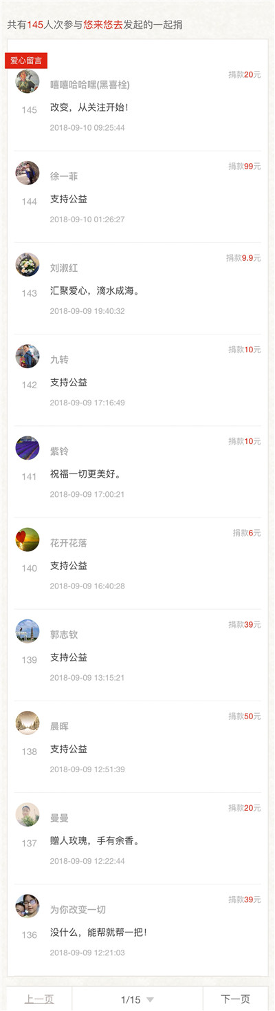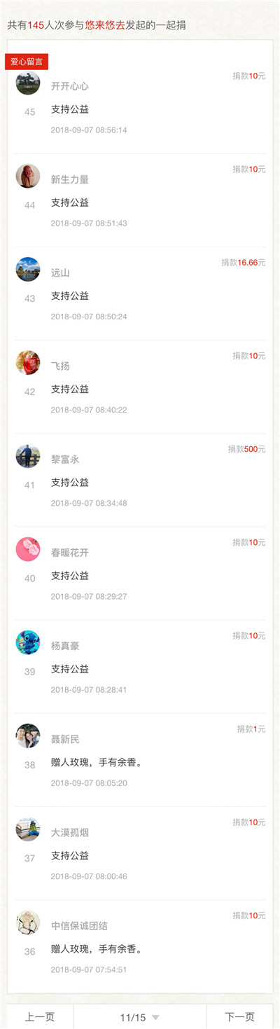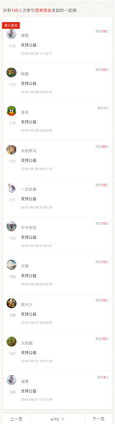 截至2018年9月10日“99公益日”感恩捐献者项目筹资公示 经前期在 网站及转发微信朋友圈和微信群,河南省红十字会开展的2018年“99公益日”线上项目筹资活动得到了社会各界爱心人士的大力支持。自9月6日至9月10日,通过“ 邀您一起献爱心”链接共接收爱心捐款3531.89元,现将捐款名单公示如下: