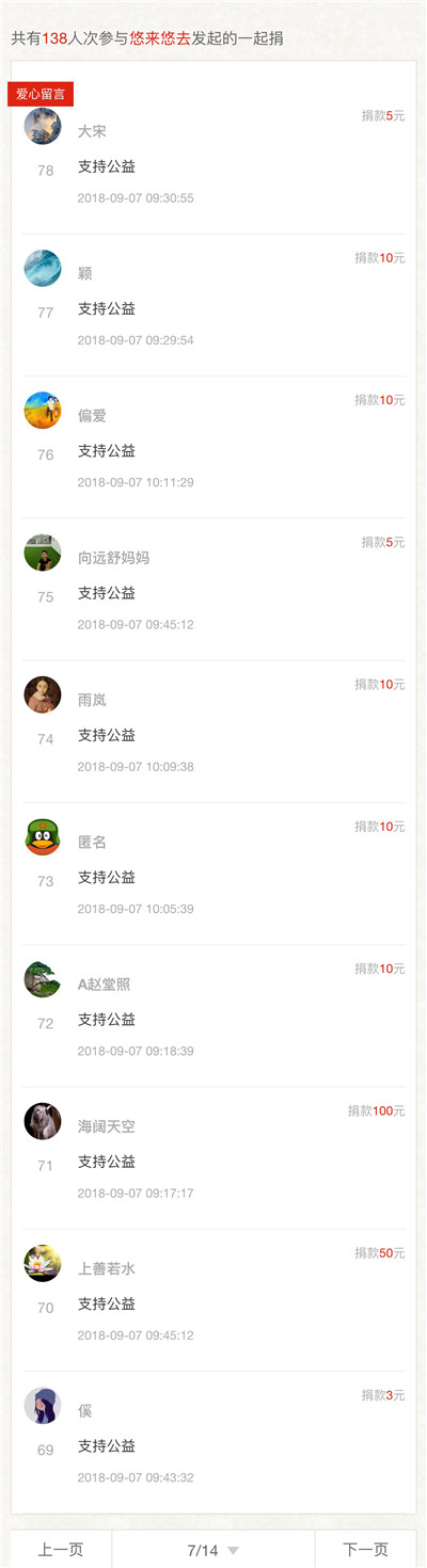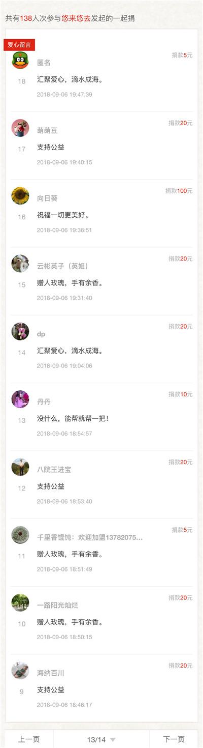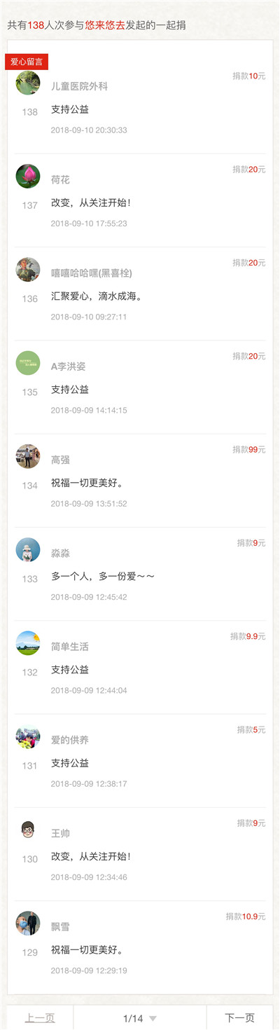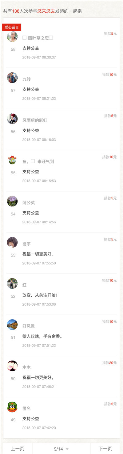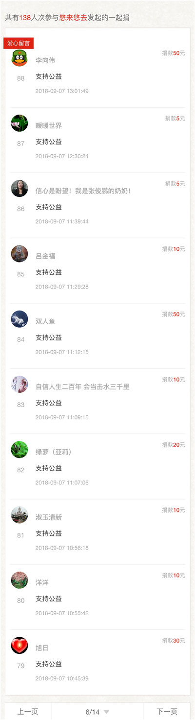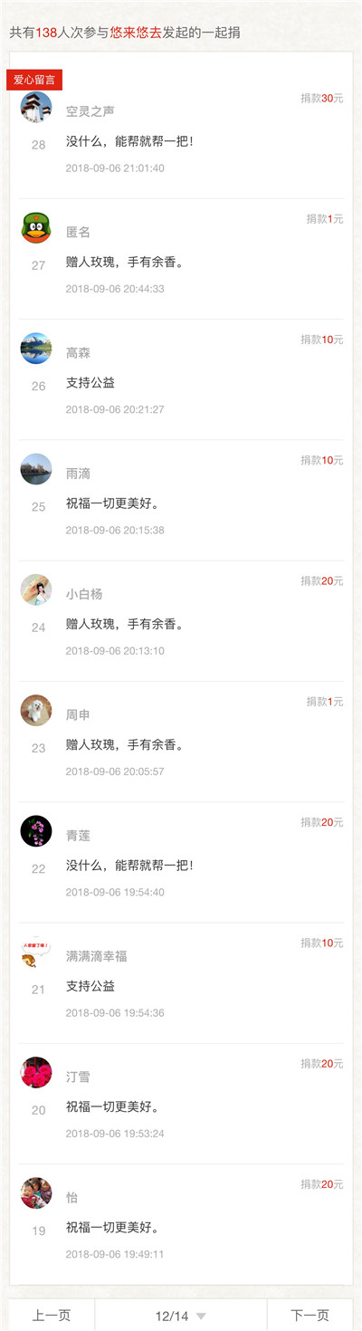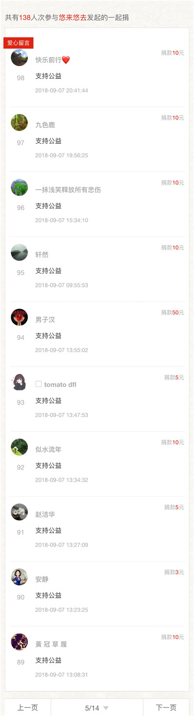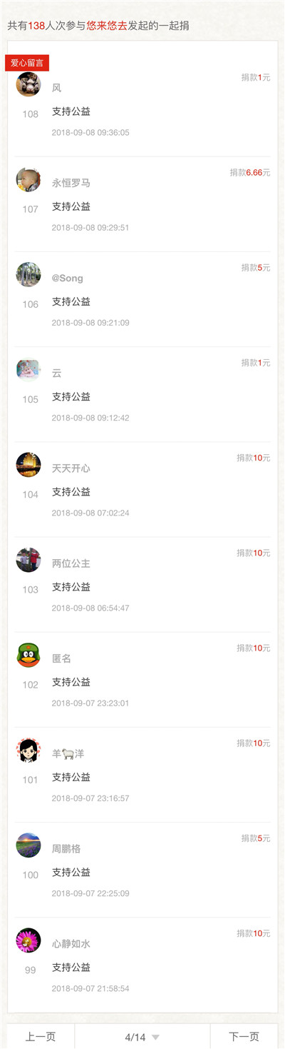 经前期在 网站及转发微信朋友圈和微信群,河南省红十字会开展的2018年“99公益日”线上项目筹资活动得到了社会各界爱心人士的大力支持。自9月6日至9月11日,通过“ 邀您一起献爱心”链接共接收爱心捐款2424.3元,现将捐款名单公示如下: