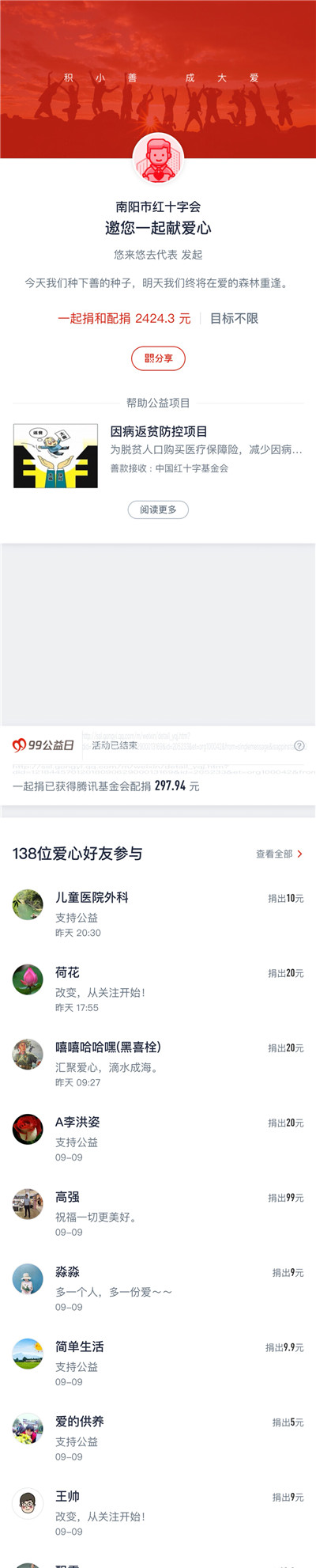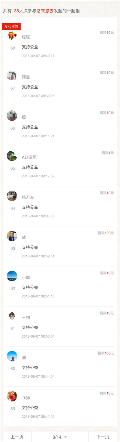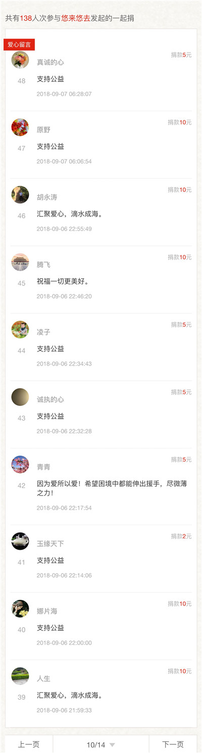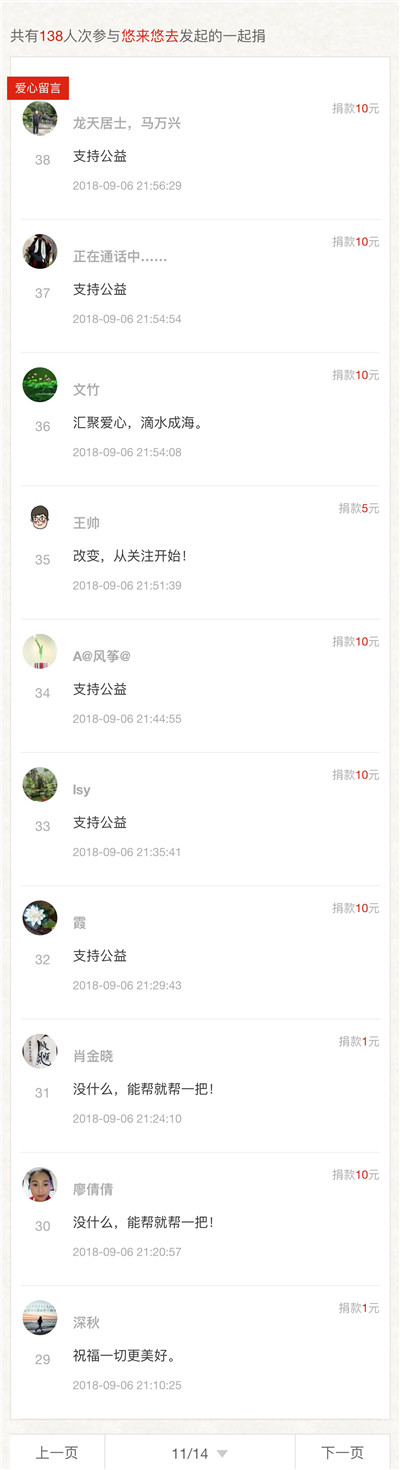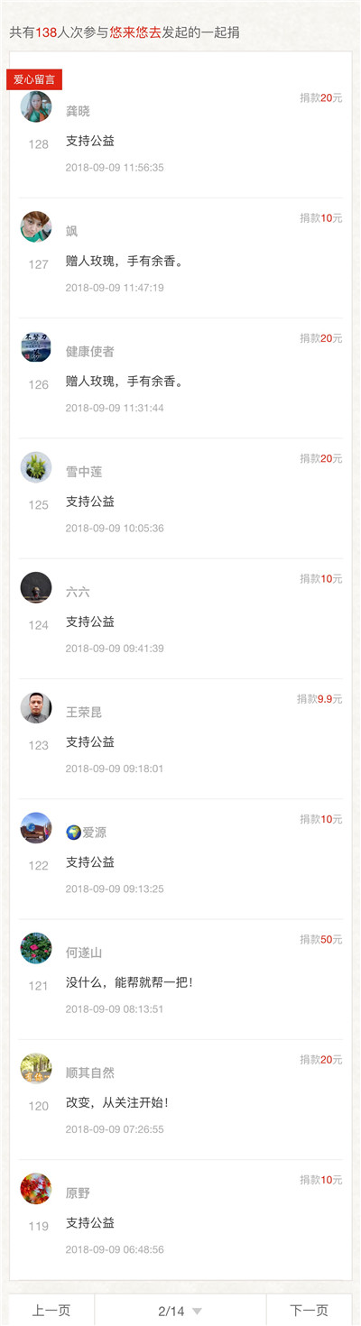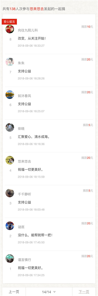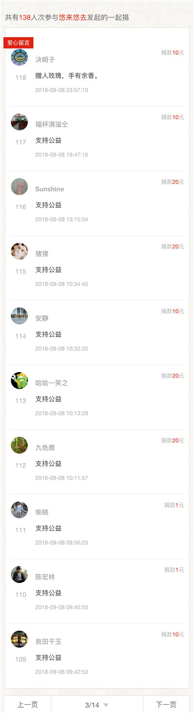 经前期在 网站及转发微信朋友圈和微信群,河南省红十字会开展的2018年“99公益日”线上项目筹资活动得到了社会各界爱心人士的大力支持。自9月6日至9月11日,通过“ 邀您一起献爱心”链接共接收爱心捐款2424.3元,现将捐款名单公示如下: