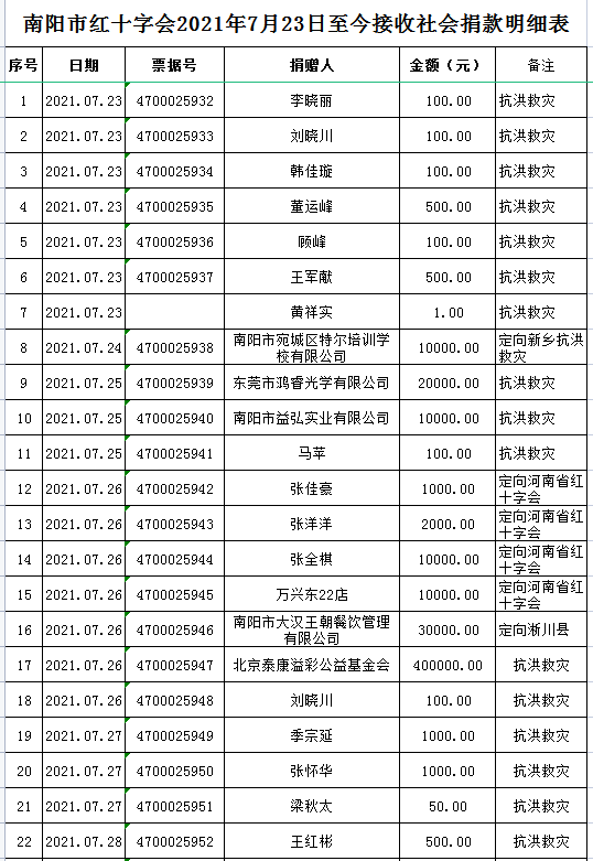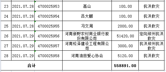 2021年7月23日8时至7月29日19时, 接收抗洪救灾捐款28笔,共计558891元。现向社会各界公布捐款个人名单。